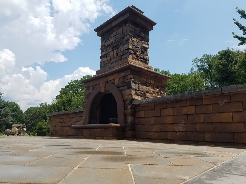 For this new home, we designed and installed a custom paver patio with wooden pavilion, fireplace with wood storage, and finished off with a small corner wall and landscaping.