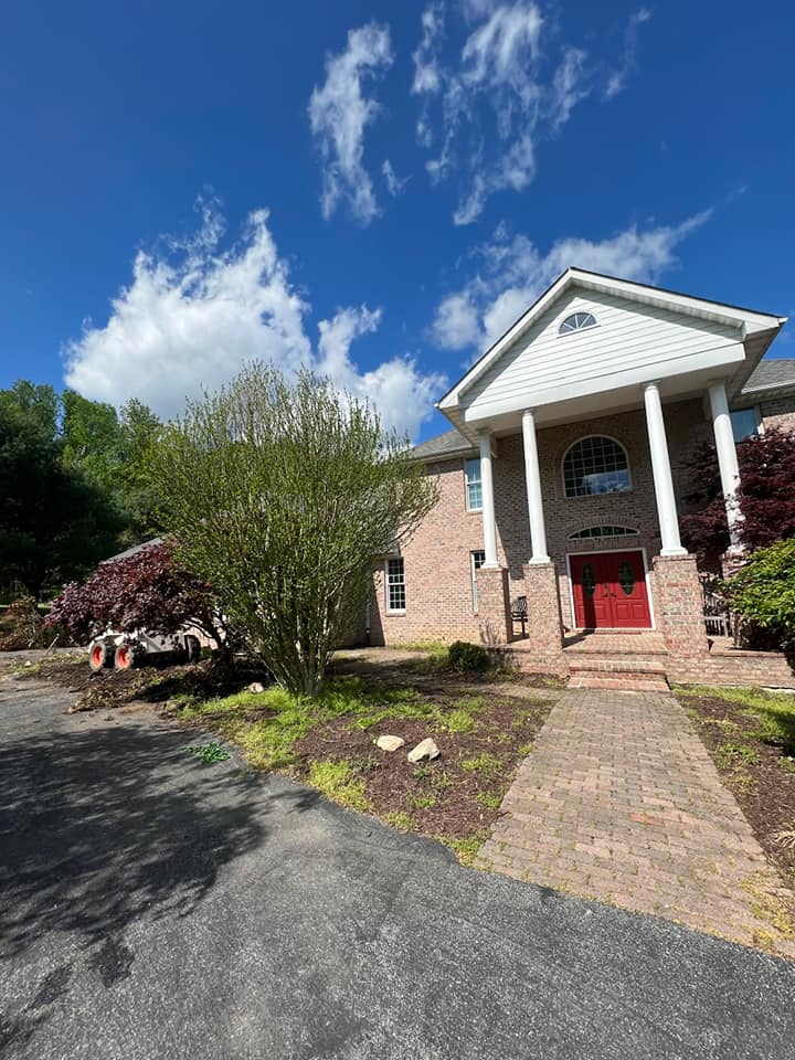 We started by removing the existing bushes, walkway and old landscaping. Then we designed and constructed a beautiful, paver walkway with circular pattern in the center. Next we added a pair of lighted stone pillars at the entrance of the walkway. And finally, the project was finished off with some fresh mulch, new trees and accent lighting.