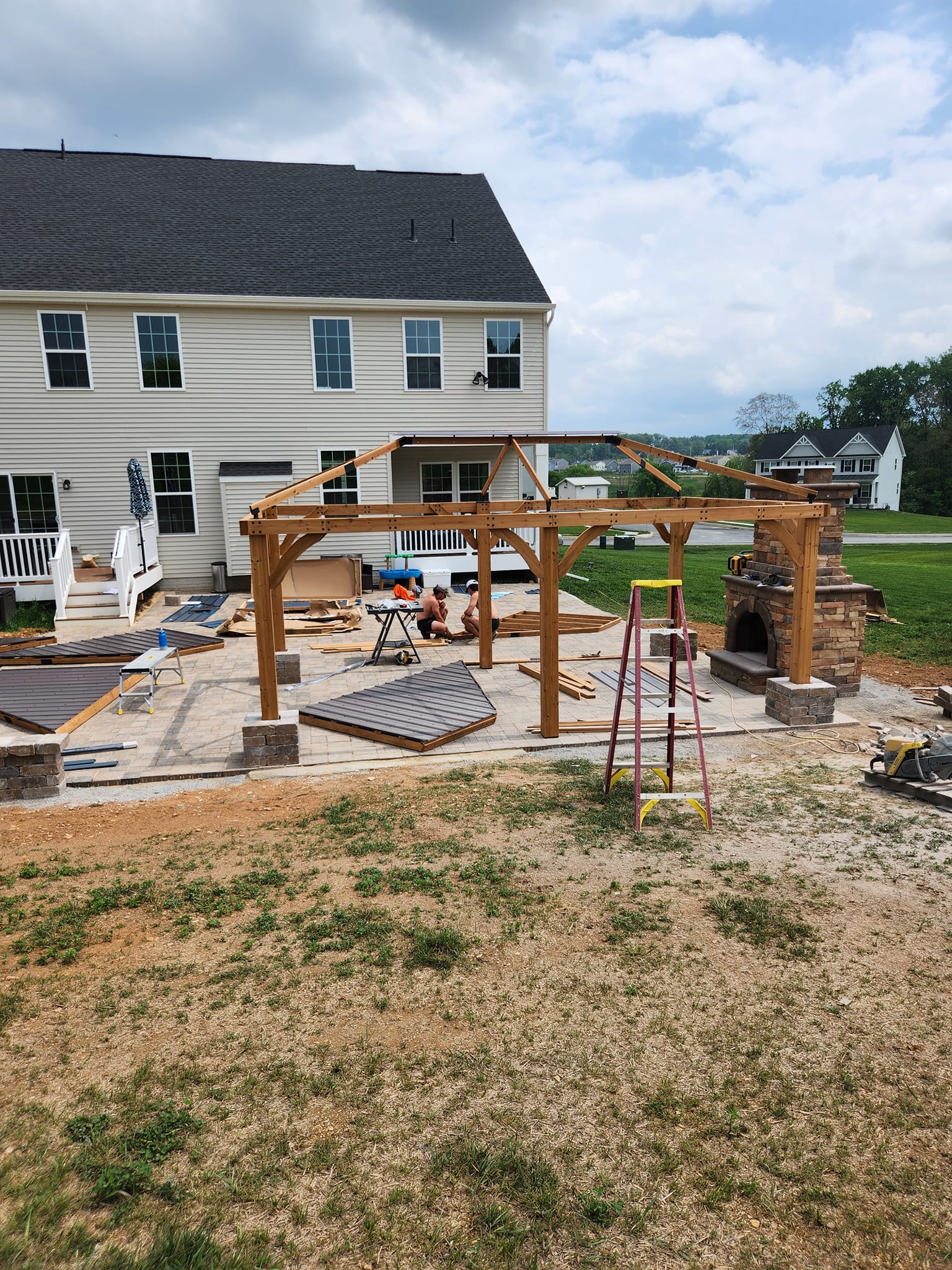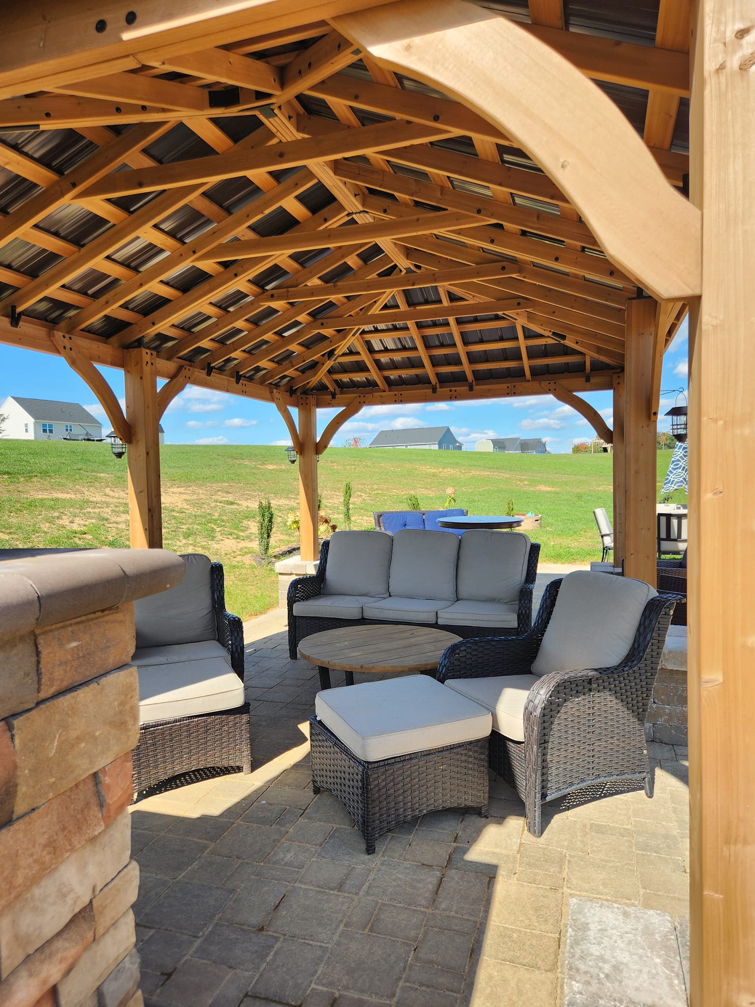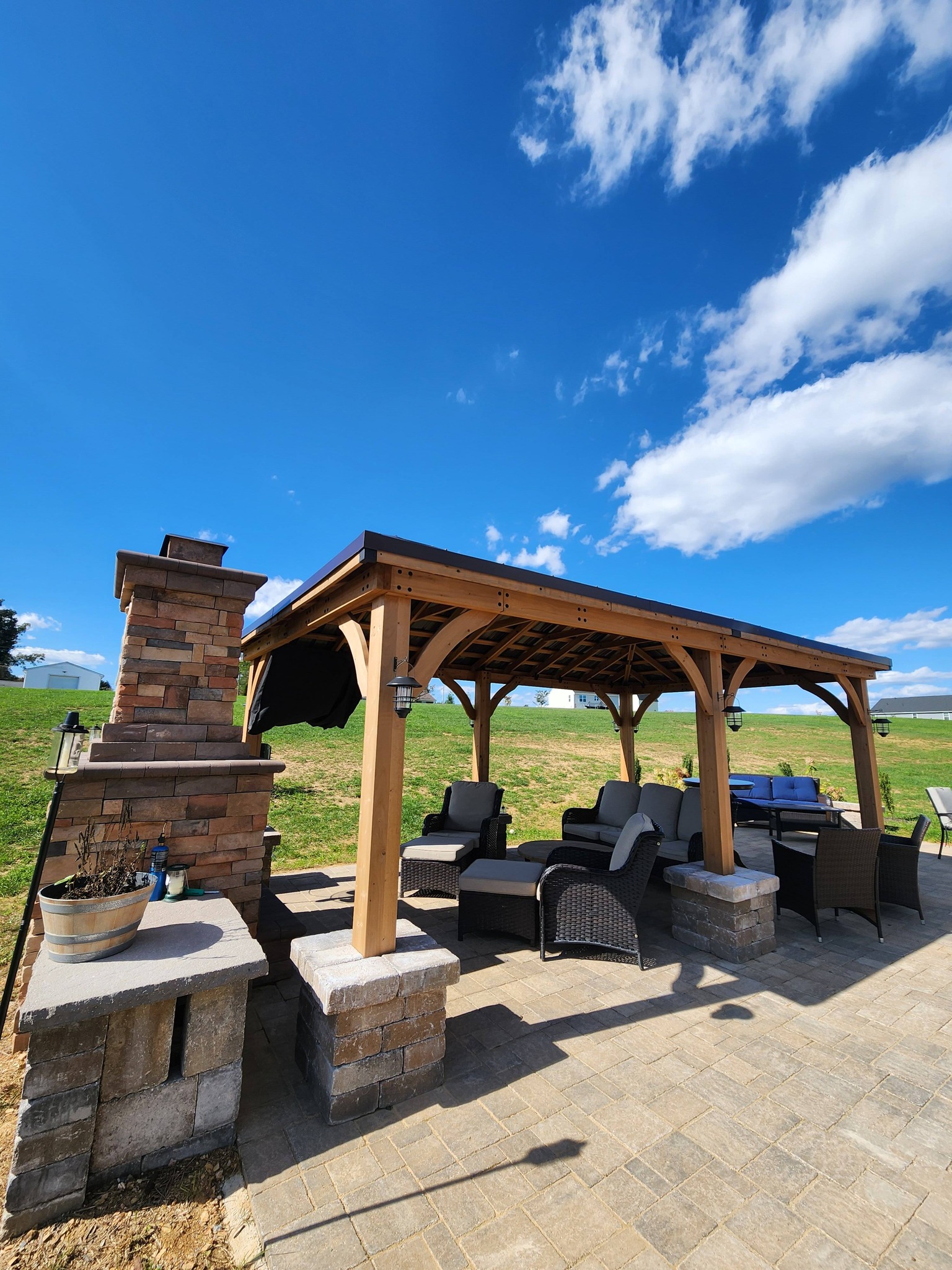 This client was looking for a large entertaining space for their new house. So we designed and installed a paver patio with wooden pavilion and outdoor fireplace with wood storage.